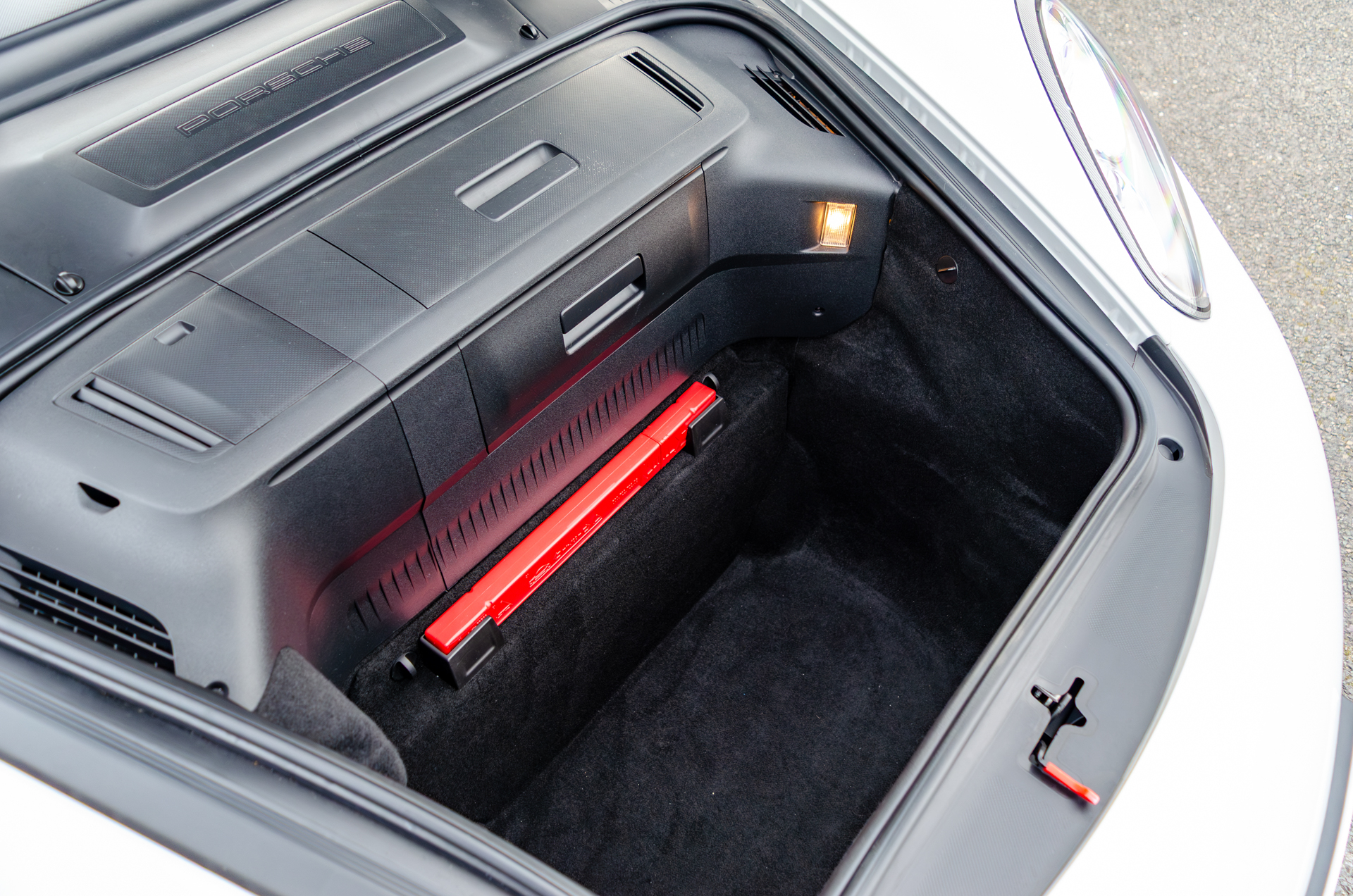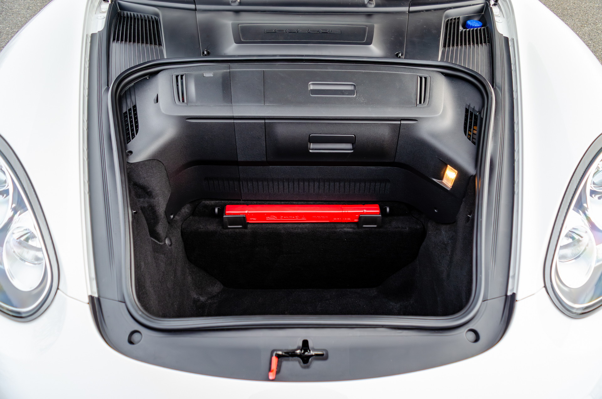 Weight? It was possible (if you binned the air-con and PCM etc) to lose 80kg, taking the Spyder’s kerb weight down to 1,275kg, which in the modern world is very light indeed. This was achieved with lightweight aluminium doors, Porsche’s lightest 19-inch road wheel, carbon bucket seats, and most significantly a clever fabric hood and carbon fibre frame, to replace the electric full-folding roof. Other notable touches, and a nod to the Spyder’s racing past were the twin-cowling humps on the rear aluminium deck, racy Porsche side stripes and a colour palette of Carrara White, Cream White, Platinum Silver, Guards Red, Aqua Blue and Basalt Black.